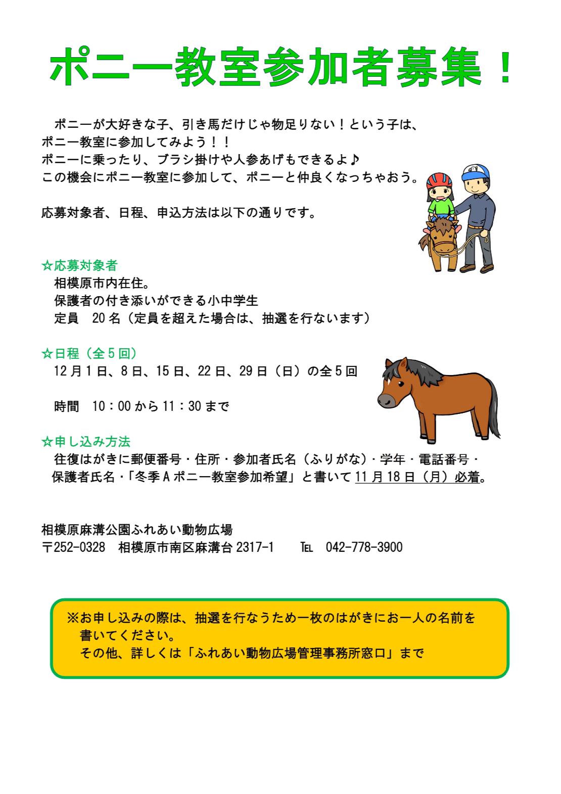 冬季Aポニー教室 募集のお知らせ〔相模原市内在住の小中学生限定〕from 麻溝公園動物広場 ポニーとたくさん触れて仲良くなってみませんか? ポニーに乗ったりお部屋の掃除をしてみよう!🐴🥕 相模原市内在住の小学生・中学生を対象とした、ポニー教室のお誘いになります!! 応募対象者、日程、申込方法は以下の通りです。 皆さんの応募お待ちしております!