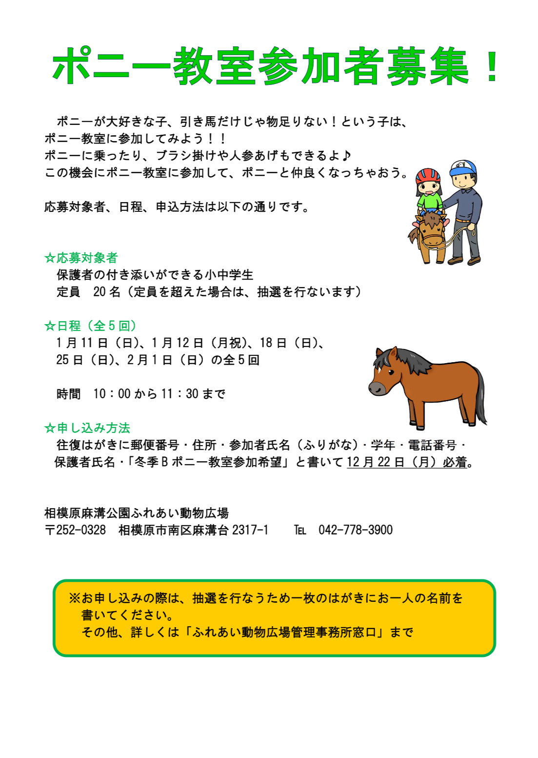 冬季Bポニー教室 参加者募集のお知らせ!!《小中学生限定》from 相模原 ポニーとたくさん触れて仲良くなってみませんか? ポニーに乗ったりお部屋の掃除をしてみよう!🐴🥕 小学生・中学生を対象とした、ポニー教室のお誘いになります!! 応募対象者、日程、申込み方法は以下の通りです。 皆さんの応募お待ちしております!