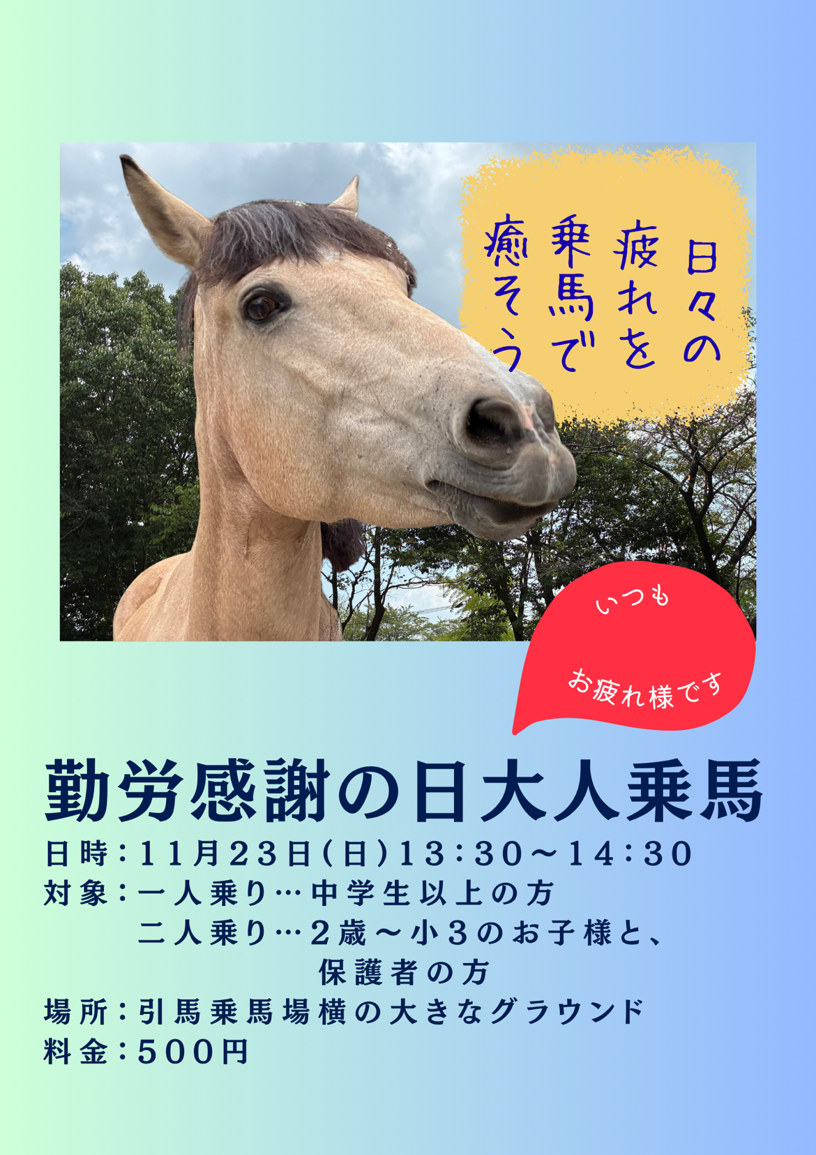 そんな皆様に、馬に癒されていただくべく、勤労感謝の日大人乗馬を行います!