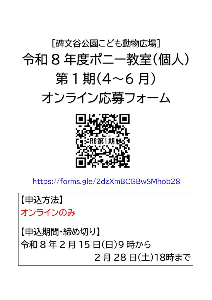 令和8年度ポニー教室(個人)の申し込みが、2月15日(日)9時~始まります。