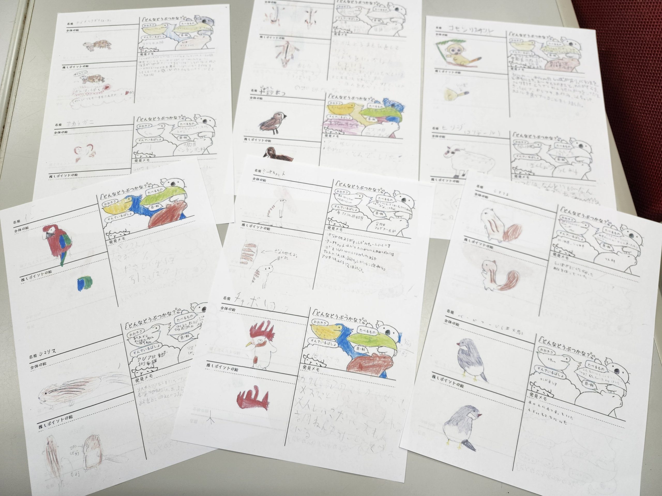 イラストは直接動物を観察して描くので苦戦している子もいましたが、写真を写すのとは違って生きている動物の特徴を捉えたリアルさのあるイラストを描いている子が多くいました。