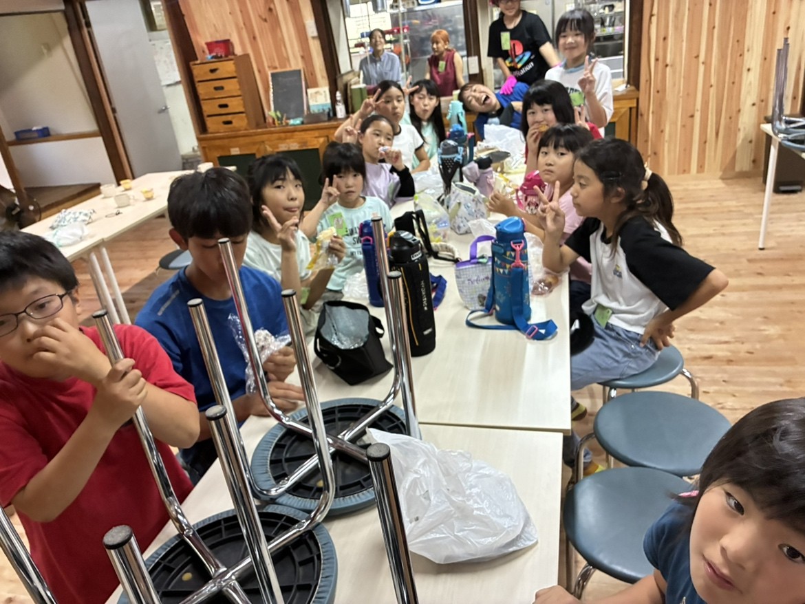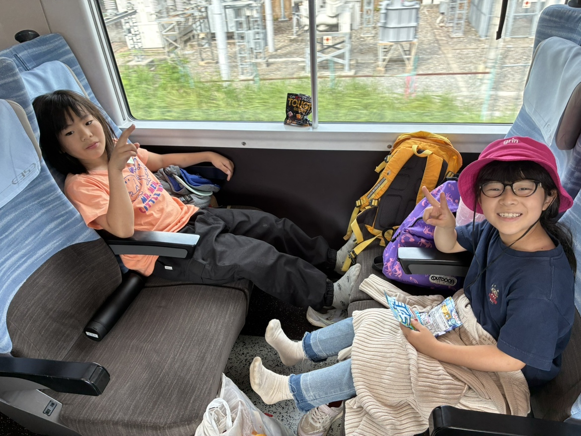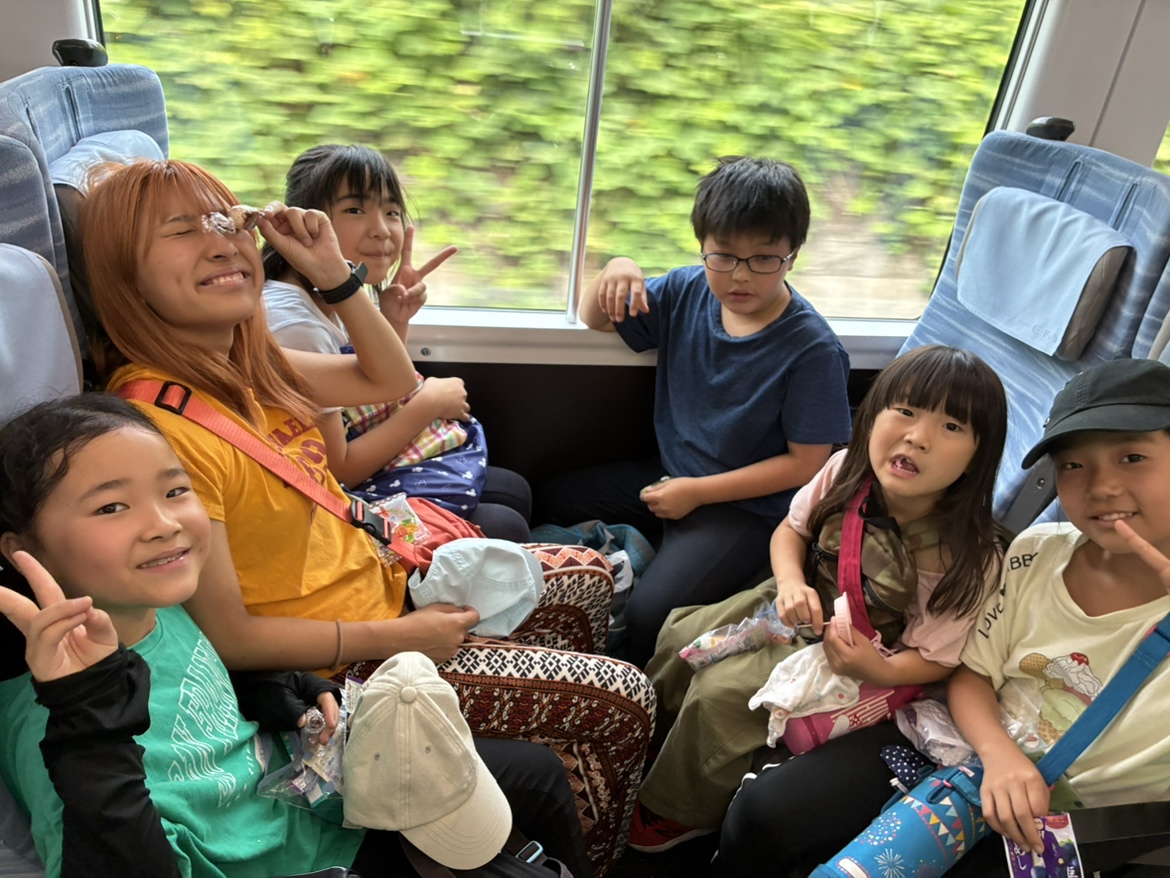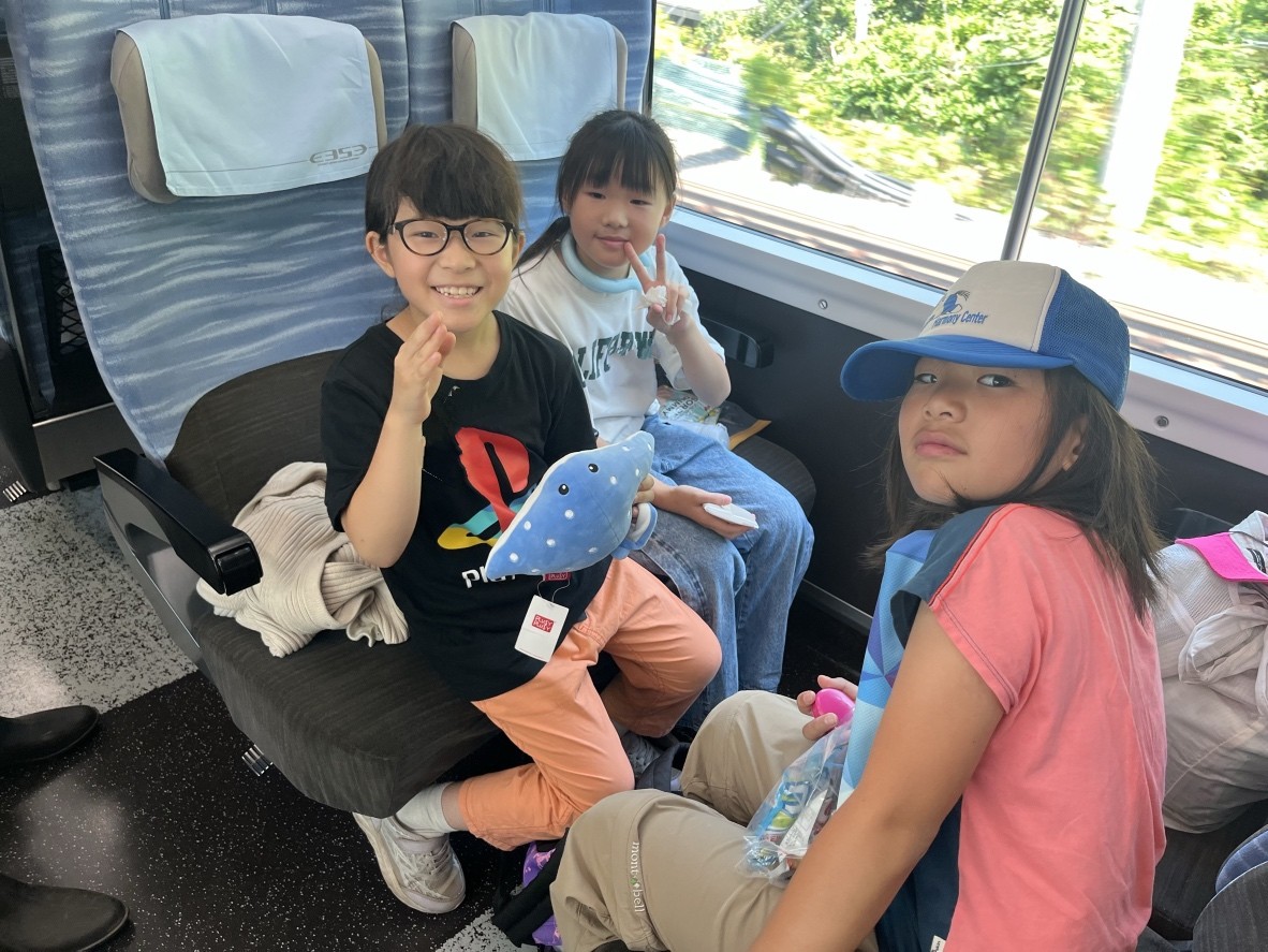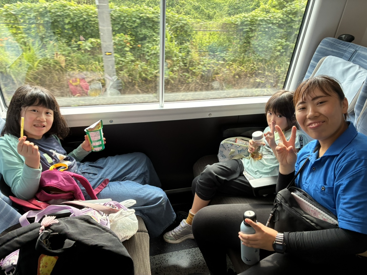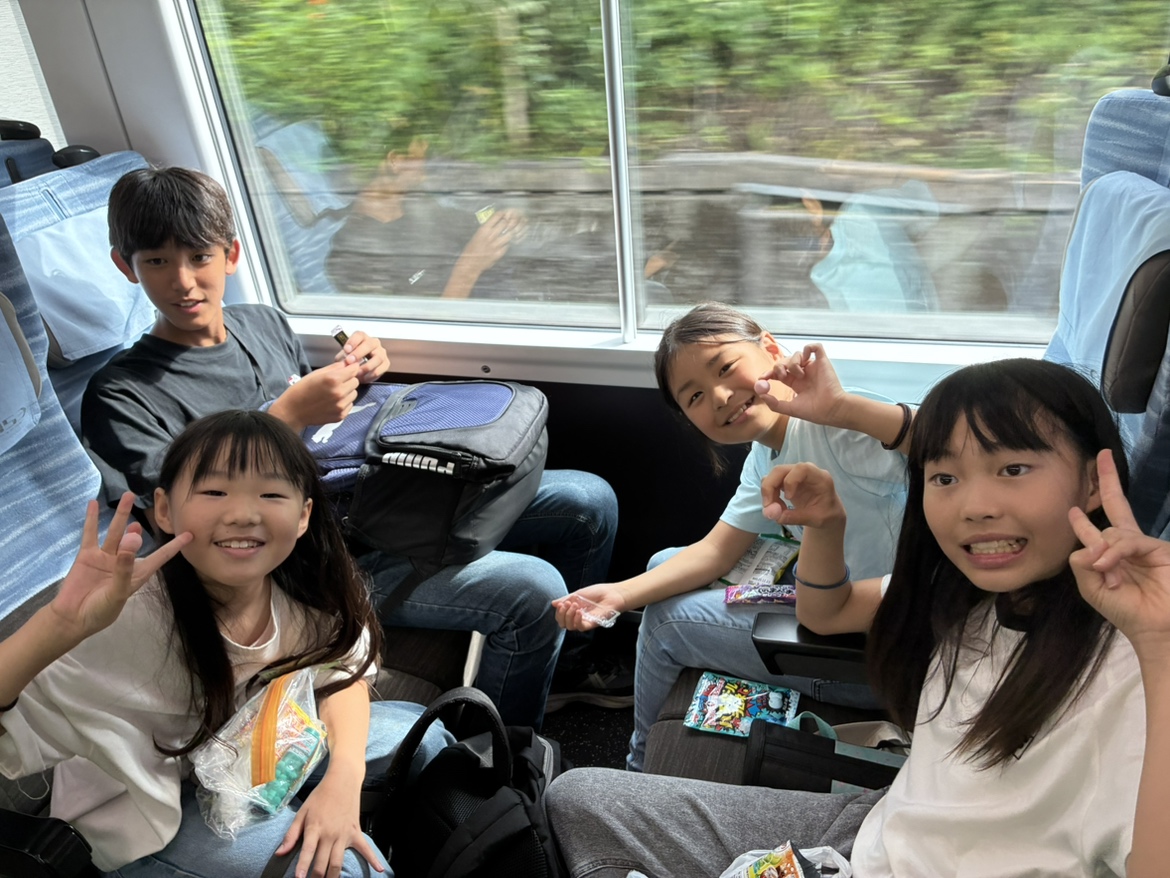 保護者の皆さんに「行ってきまーす!」の挨拶をしたあと、あずさの中では持参したおやつを交換する子やカードゲームで遊ぶ子など思い思いの過ごし方をしていました。