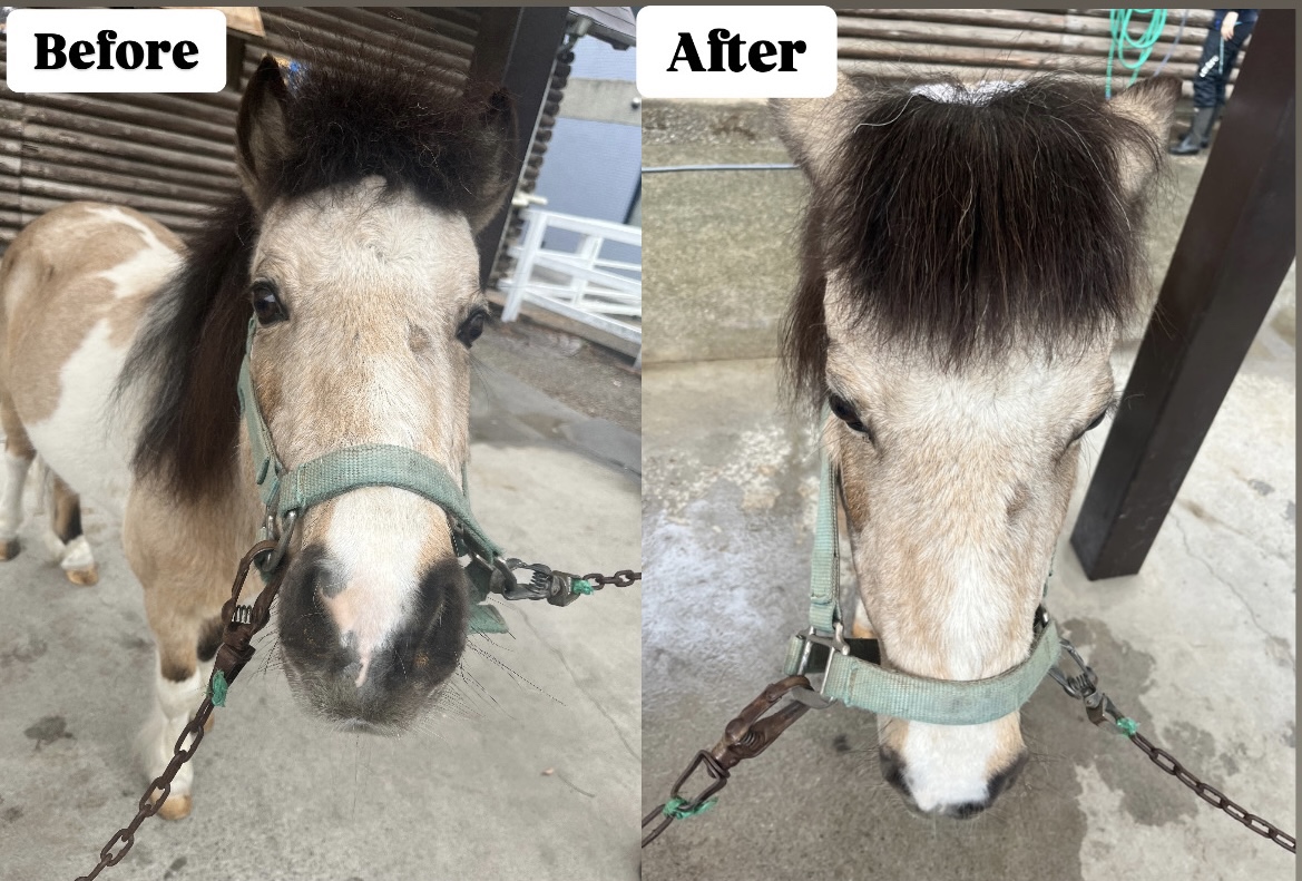 濃い茶色の前髪が特徴的なパピコちゃんは前髪とたてがみを洗い、カットしてさっぱりしました😄