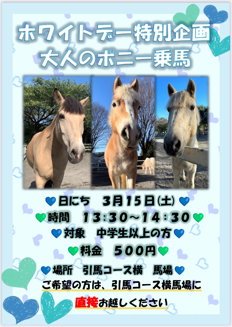 3月も大人のポニー乗馬特別企画を行います!!