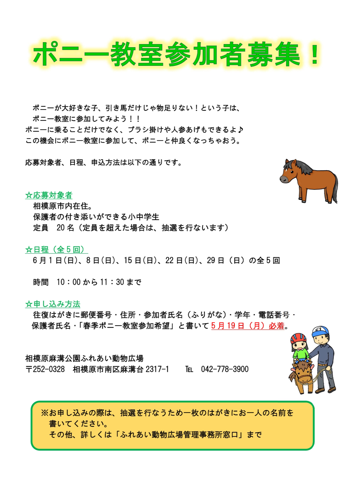 明日(4/9)より、5/14(水)、5/21(水)、5/28(水)の健康づくりポニー乗馬、受付開始です。