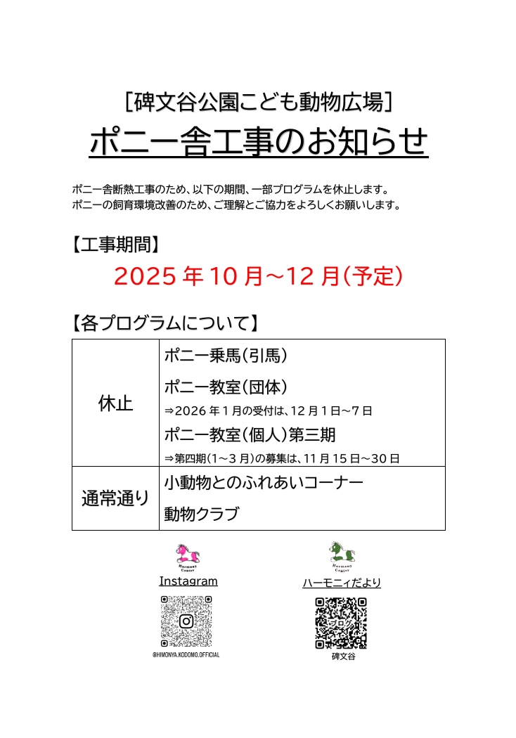 皆様にご不便やご迷惑をおかけいたしますが、ポニー舎の飼育環境改善の為、ご理解とご協力をよろしくお願いいたします。