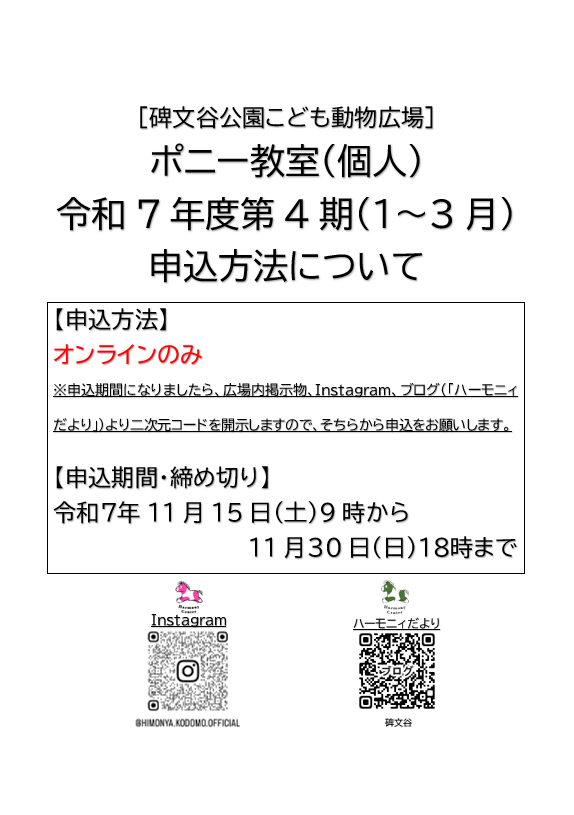 令和7年度第4期(1~3月)ポニー教室(個人)申込方法についてのご案内です。