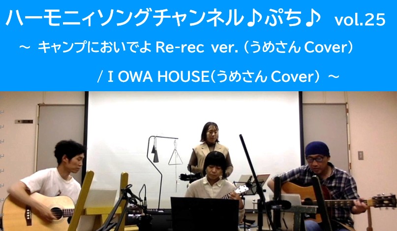 さて今回は多くのハーモニィソングの産みの親でLIVEに一緒に出演する~うめさん~の曲にチャレンジしました。「キャンプにおいでよRe-rec ver. (うめさんCover)」 「I OWA HOUSE(うめさんCover)」の2曲をお届けです。「ハーモニィソングチャンネルぷち」でWEB検索もしくは下記URLにアクセスしてお楽しみください。